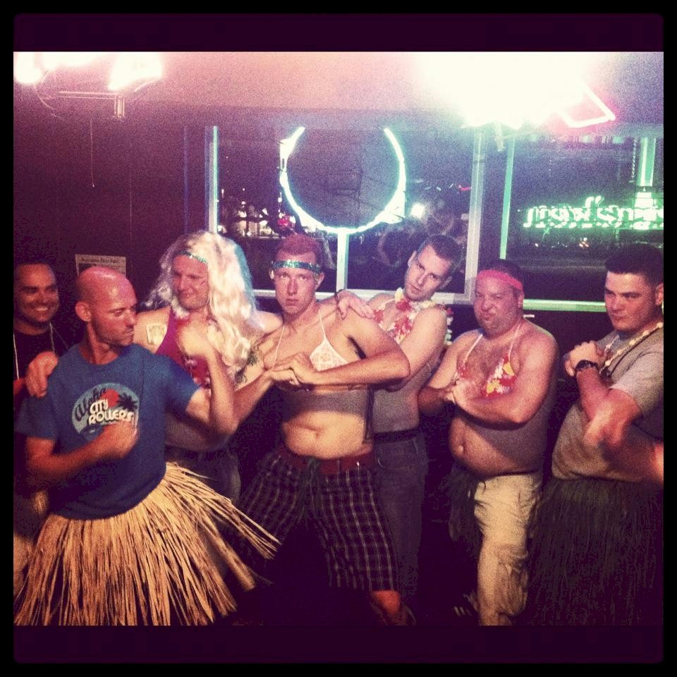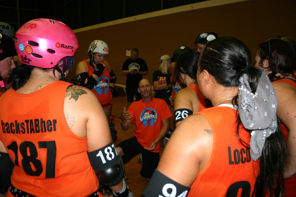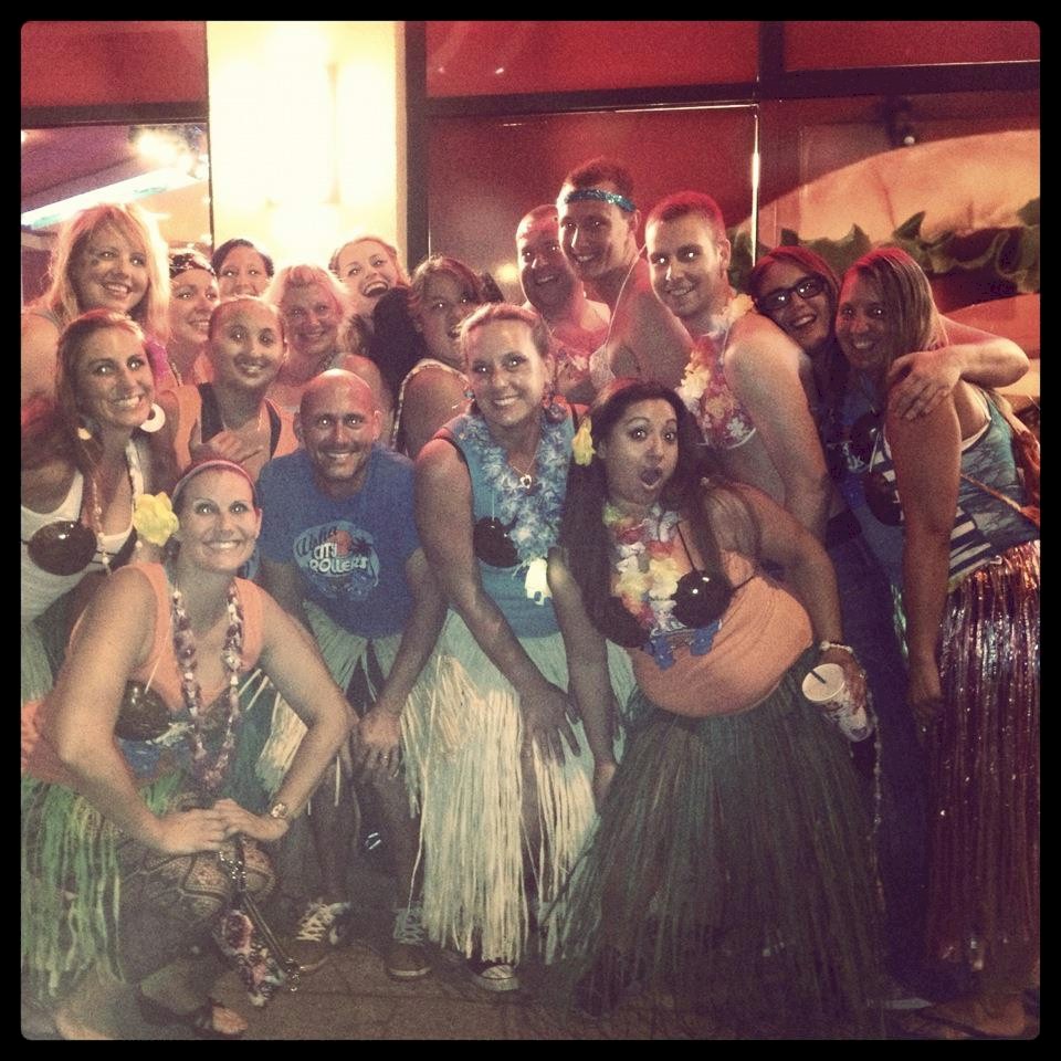 The B.O.T.I. was hosting an after party at a bar in a private room. ACR members met outside the bar so we could all go in together. We decided to go with an Aloha theme and everyone wore grass hula skirts and the guys wore coconut bras and bikini tops too. The private room was located on the 2nd floor of the bar and you had to walk up a set of stairs to get there. ACR walked in together single file stomping our feet twice then clapping once chanting “We will… we will.. ROCK YOU!”. We did this walking up the stairs and then circled the room. The room went wild joining in and cheering! ACR handed out stickers and sold tshirts to our new fans. Handsome and I received many complements from members of other leagues all night about how amazing our skaters are and what awesome team spirit Aloha City Rollers has. ACR won that after party! This day and this after party ranks in the top 10 happy experiences of my life and top three roller derby experiences. This was an AMAZING day and awesome after party! Above is a slide show of a few memories from that day. Below are videos taken by others of the tournament including the entire first and second half of the first tournament game!