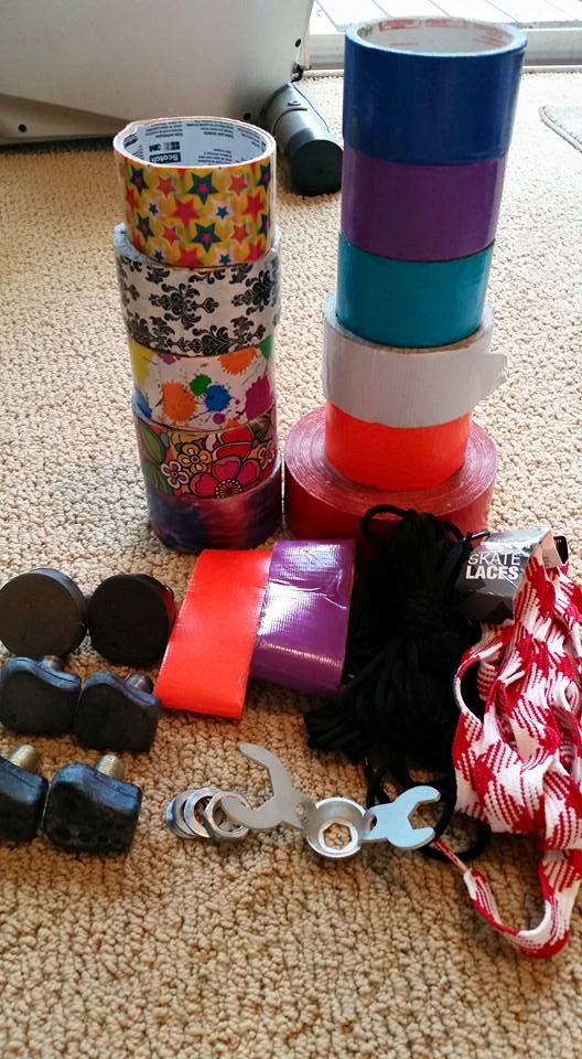 If your skates or protective padding starts to wear holes you can do a repair with duct tape or medical tape. Duct tape is also great for covering laces during bouts to ensure your laces wont get scraped and break during the bout. A generous layer of duct tape is often added to the toe area of skates to help protect the boot from wearing a hole in it when the toe gets dragged on the ground. You can also add leather toe guards or plastic toe caps to your skates to help protect it.