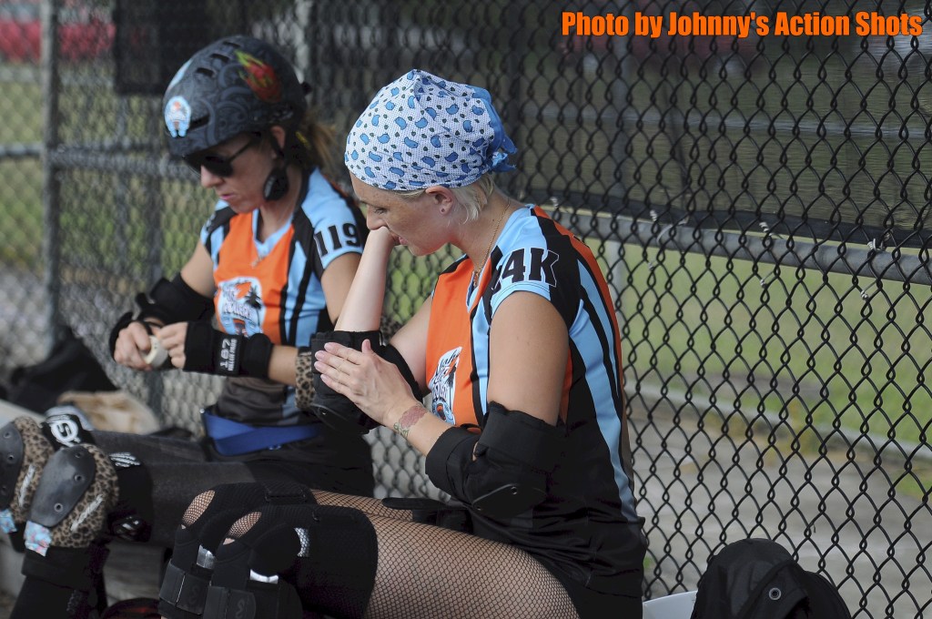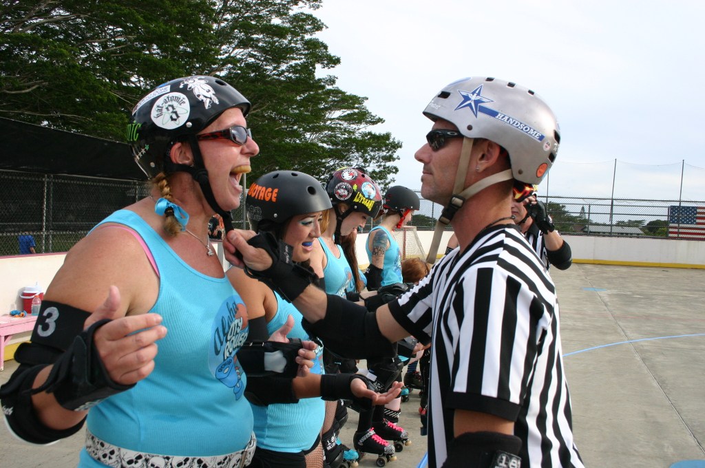 Roller skating can be dangerous and even deadly. It is essential for anyone on roller skates to wear safety gear, ALWAYS, even if just street skating or skating for fun in the driveway. Roller Derby is a full contact sport on roller skates. New roller derby player and referee recruits can expect to invest a few hundred dollars into their initial purchase of skates, safety equipment, and other derby gear. The minimum equipment required to play or referee the sport of roller derby is quad roller skates, knee pads, elbow pads, wrist guards, helmet and mouth guard.