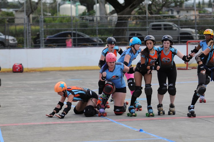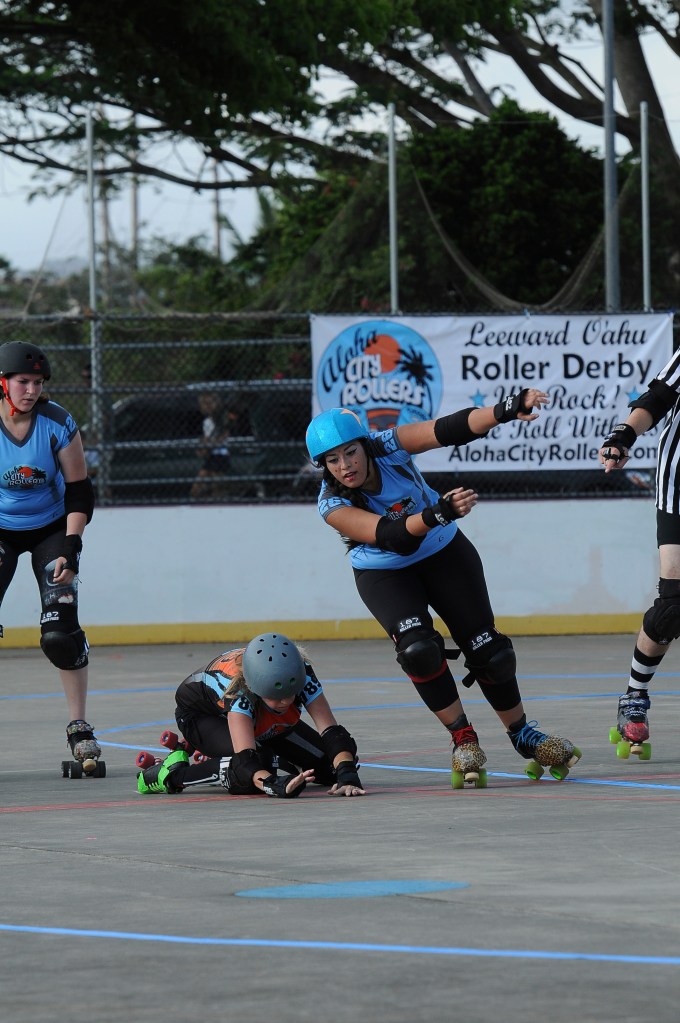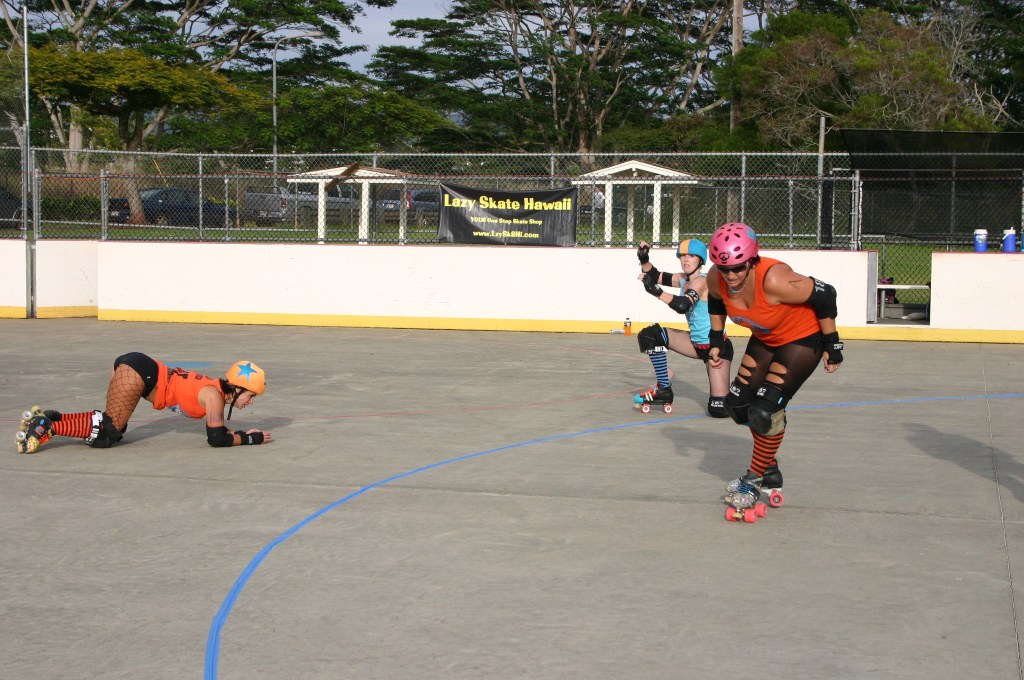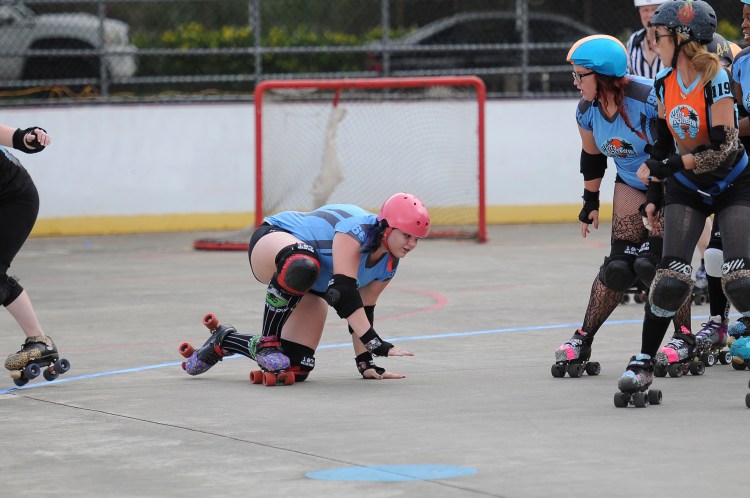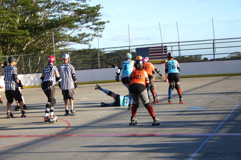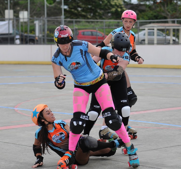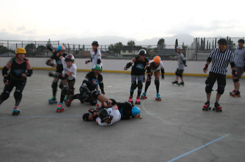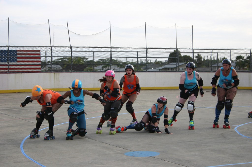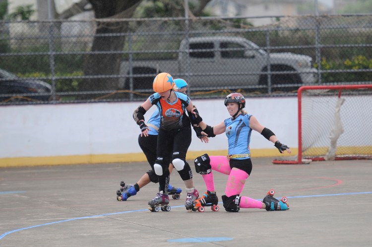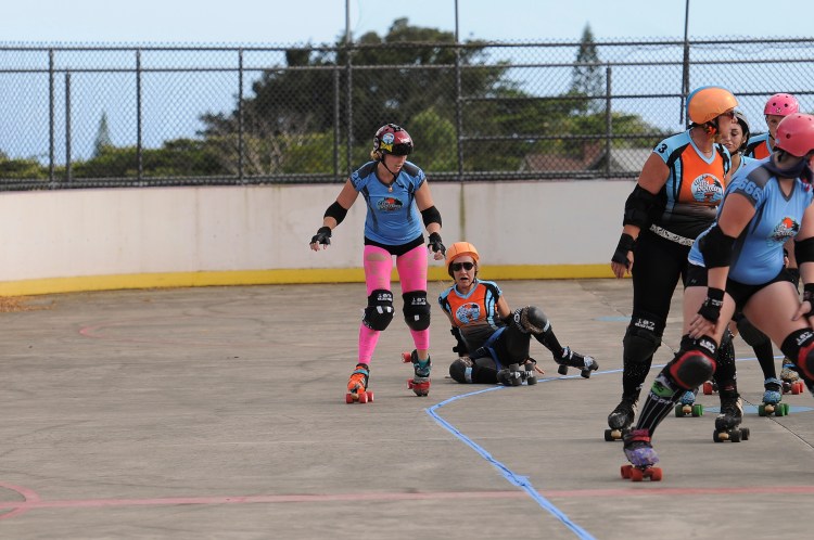 Falling is part of playing roller derby. Players do things on skates that are challenging to do even when wearing sneakers! Players fall by getting knocked down, tripping, and slipping. Players learn and practice many types of falls to be able to safely react to different situations. Players still get injured even though they train and wear safety equipment suffering sprains, strains, scrapes, bruises, cuts, dislocations, broken bones, and concussions. Roller derby players train to fall forward and use the padding and protective gear. Below are is a slideshow of intentional and unintentional fall highlights from Aloha City Rollers games, scrimmages and practices.