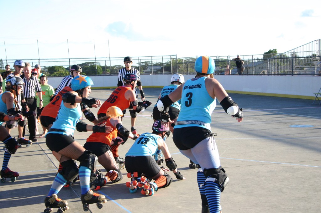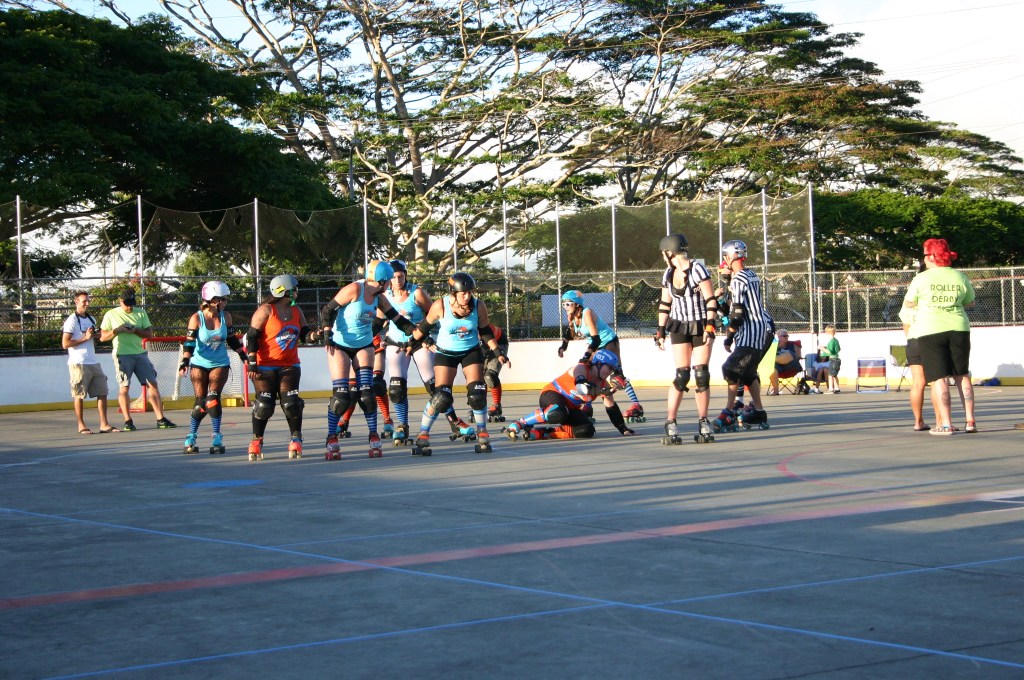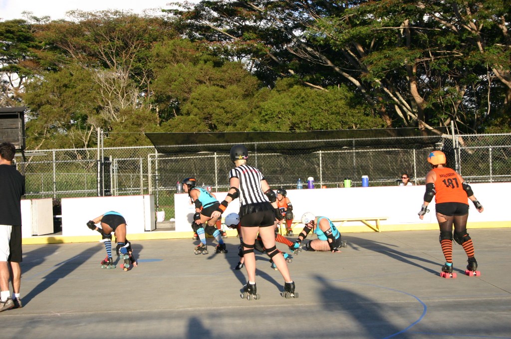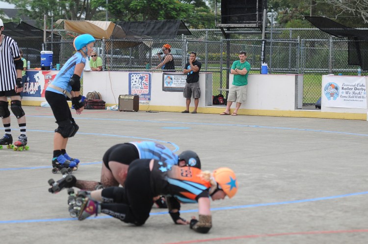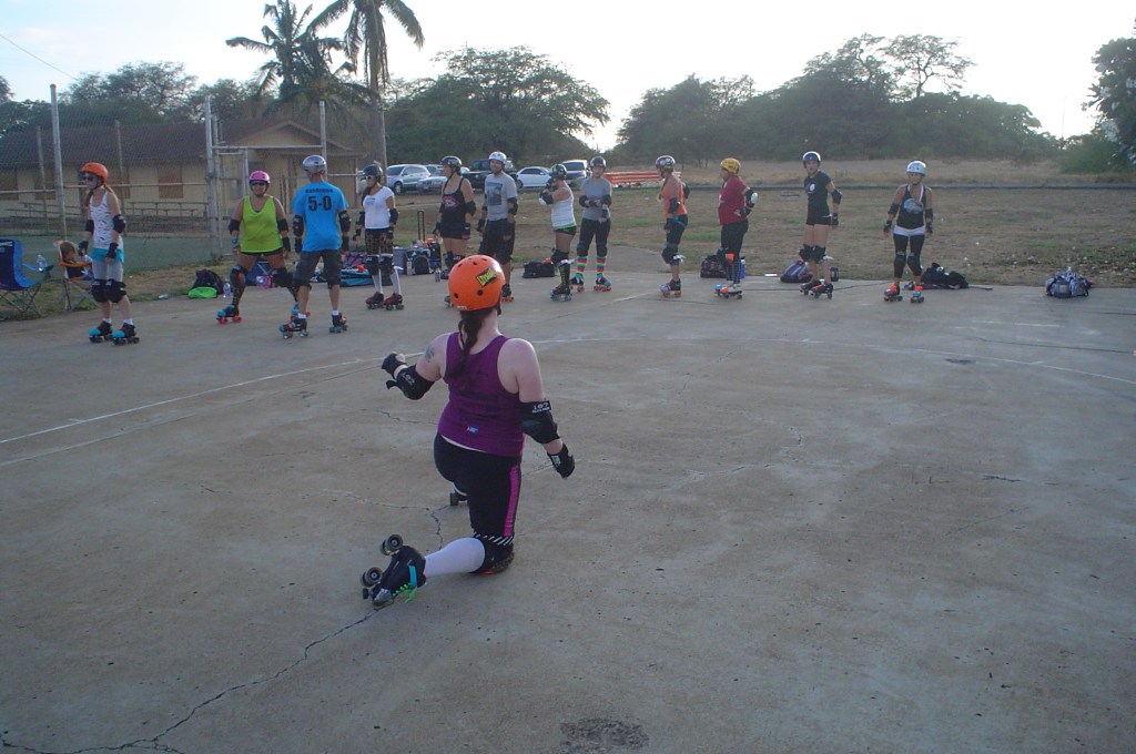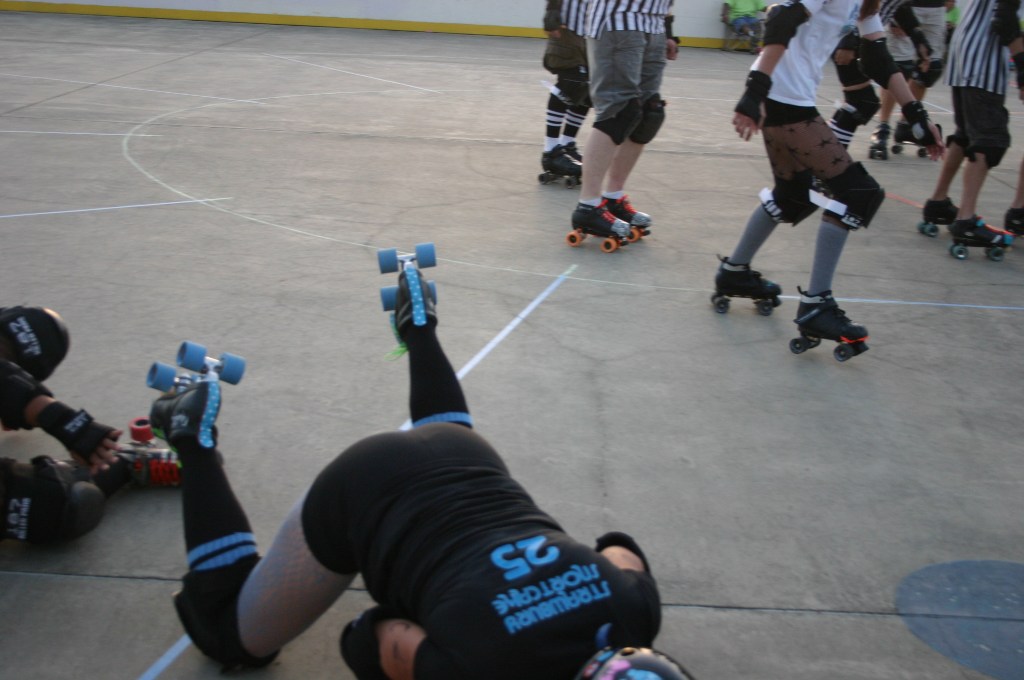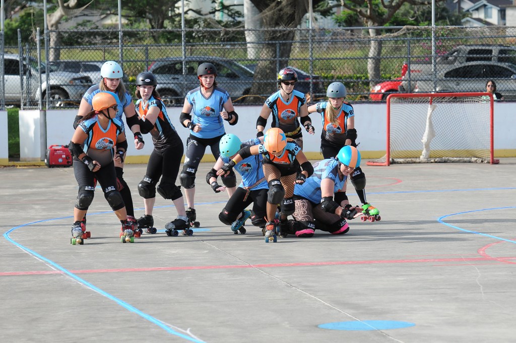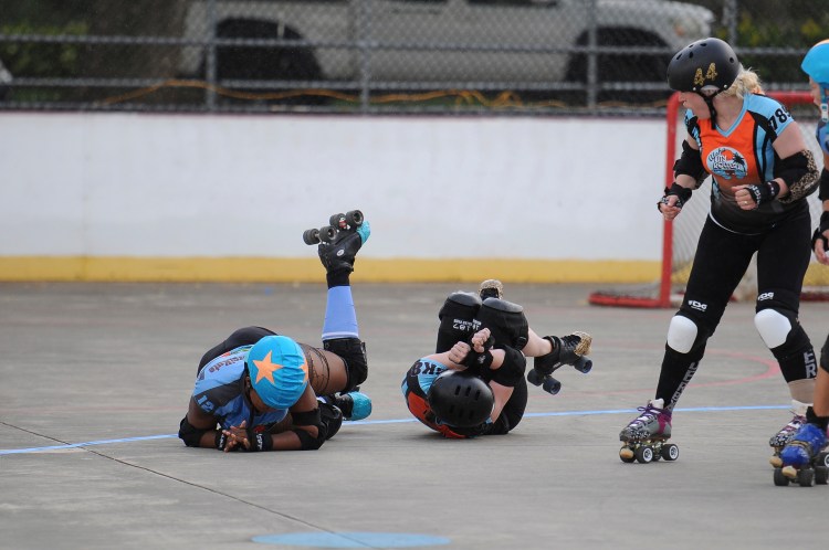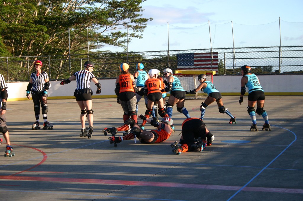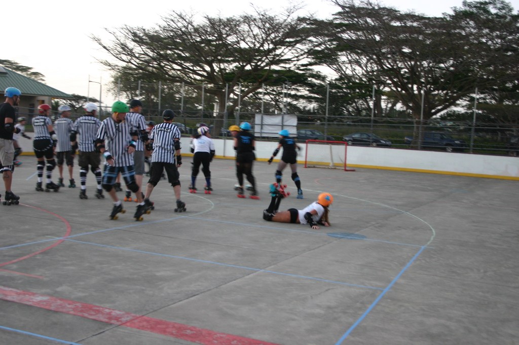 Falling is part of playing roller derby. Players do things on skates that are challenging to do even when wearing sneakers! Players fall by getting knocked down, tripping, and slipping. Players learn and practice many types of falls to be able to safely react to different situations. Players still get injured even though they train and wear safety equipment suffering sprains, strains, scrapes, bruises, cuts, dislocations, broken bones, and concussions. Roller derby players train to fall forward and use the padding and protective gear. Below are is a slideshow of intentional and unintentional fall highlights from Aloha City Rollers games, scrimmages and practices.