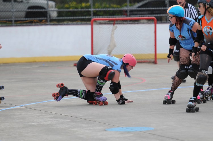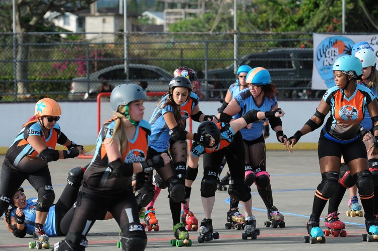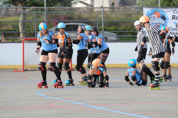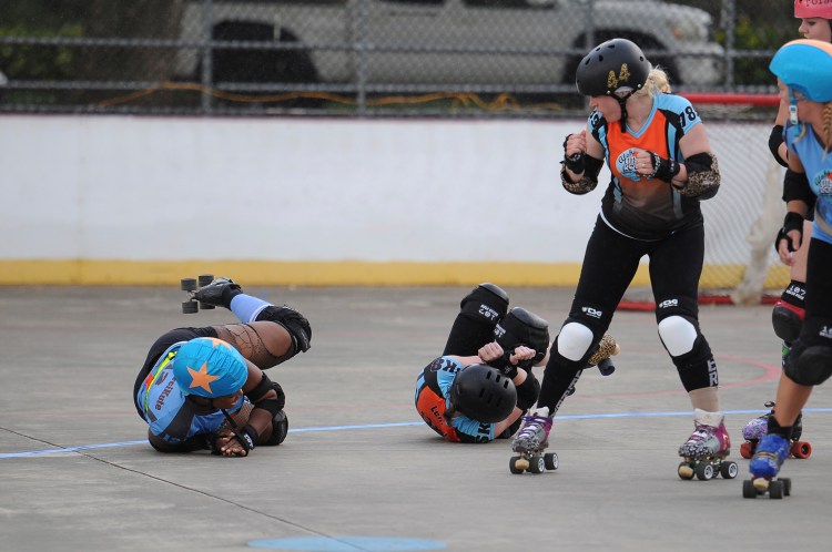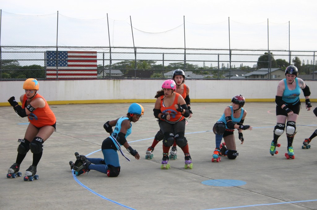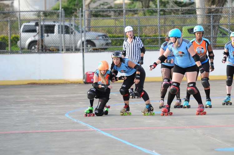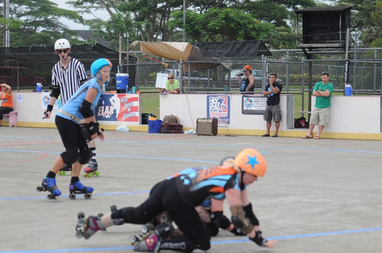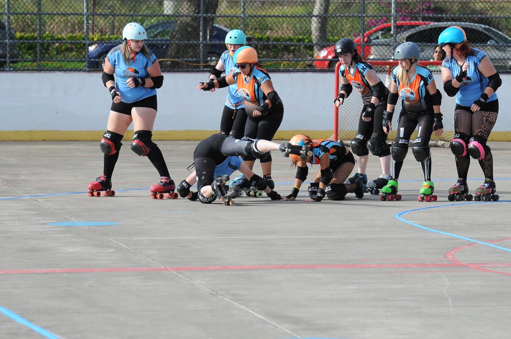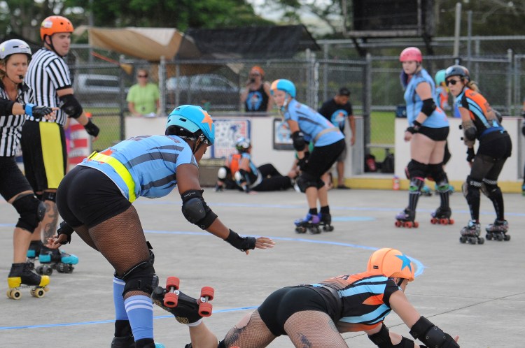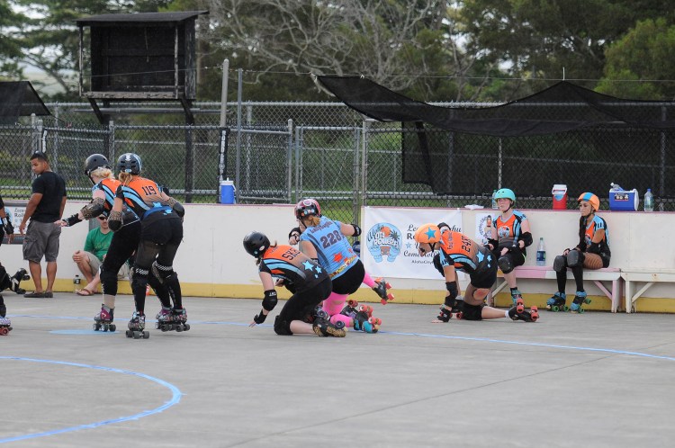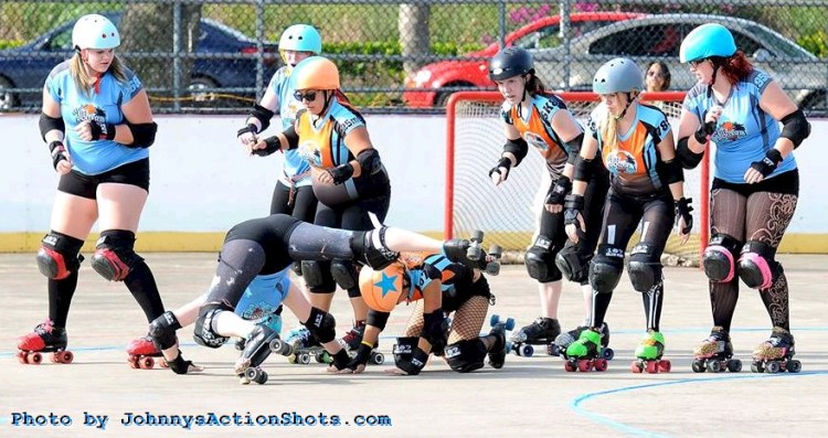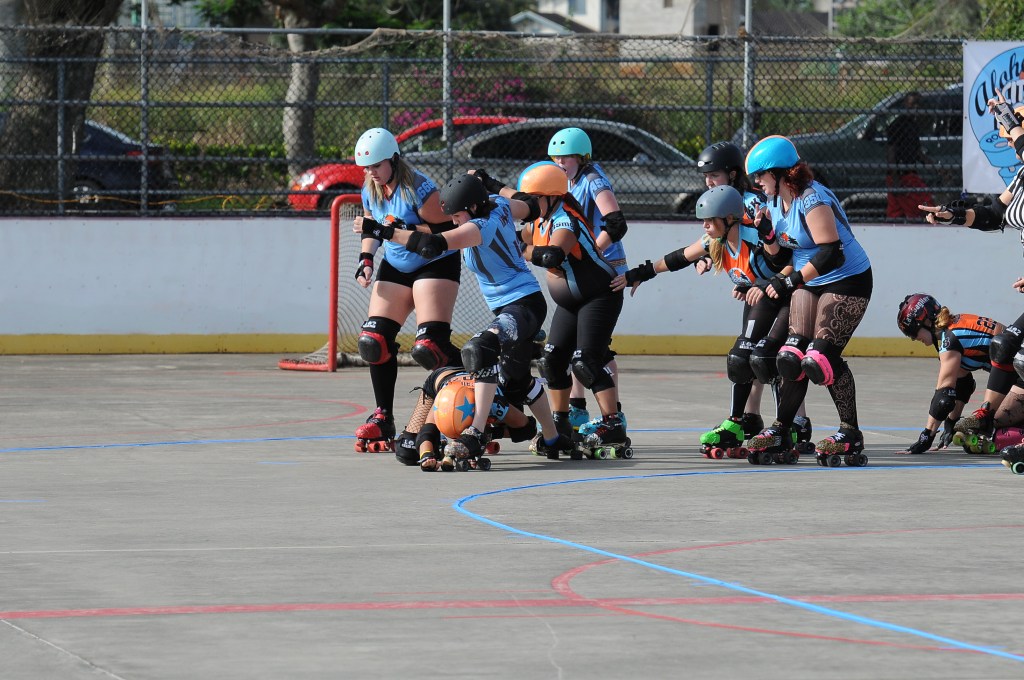 Falling is part of playing roller derby. Players do things on skates that are challenging to do even when wearing sneakers! Players fall by getting knocked down, tripping, and slipping. Players learn and practice many types of falls to be able to safely react to different situations. Players still get injured even though they train and wear safety equipment suffering sprains, strains, scrapes, bruises, cuts, dislocations, broken bones, and concussions. Roller derby players train to fall forward and use the padding and protective gear. Below are is a slideshow of intentional and unintentional fall highlights from Aloha City Rollers games, scrimmages and practices.