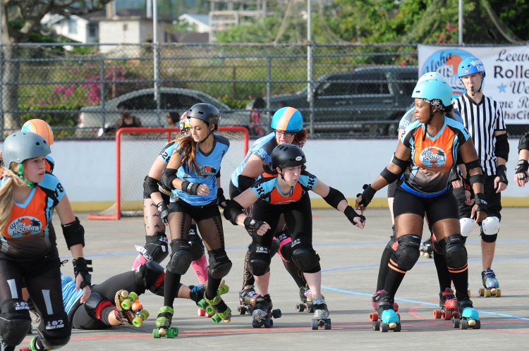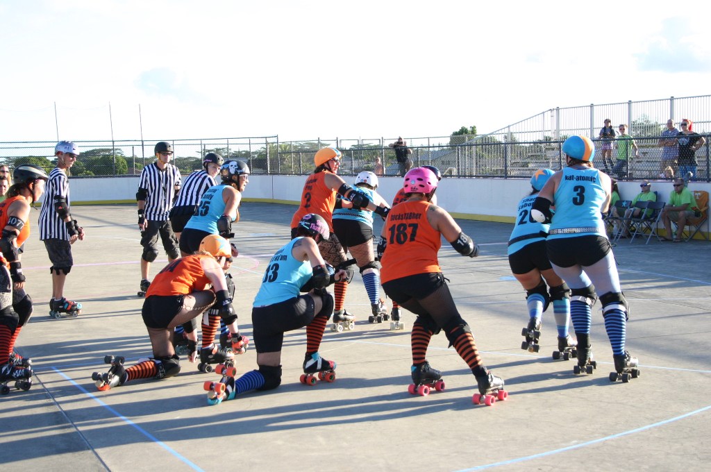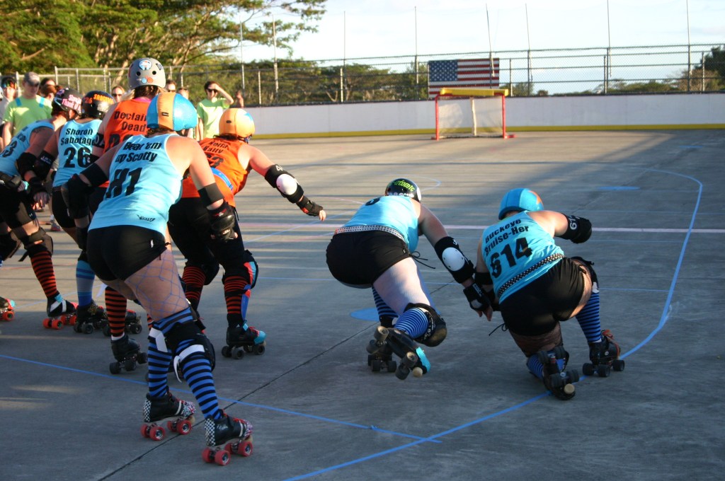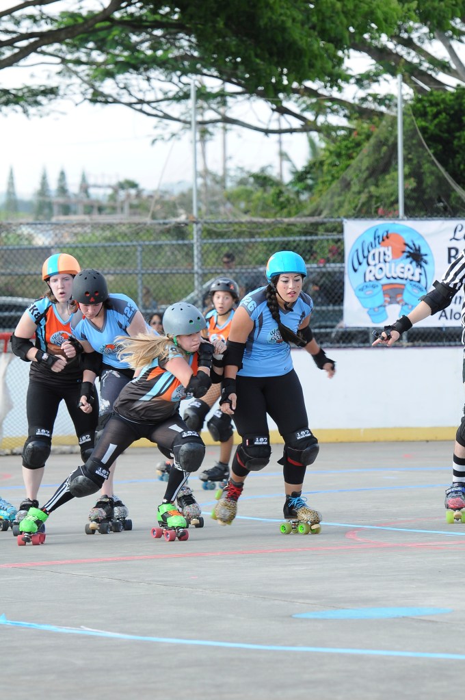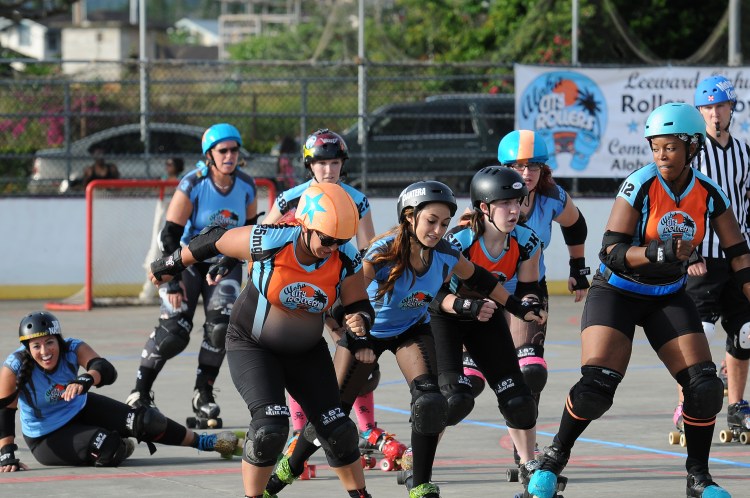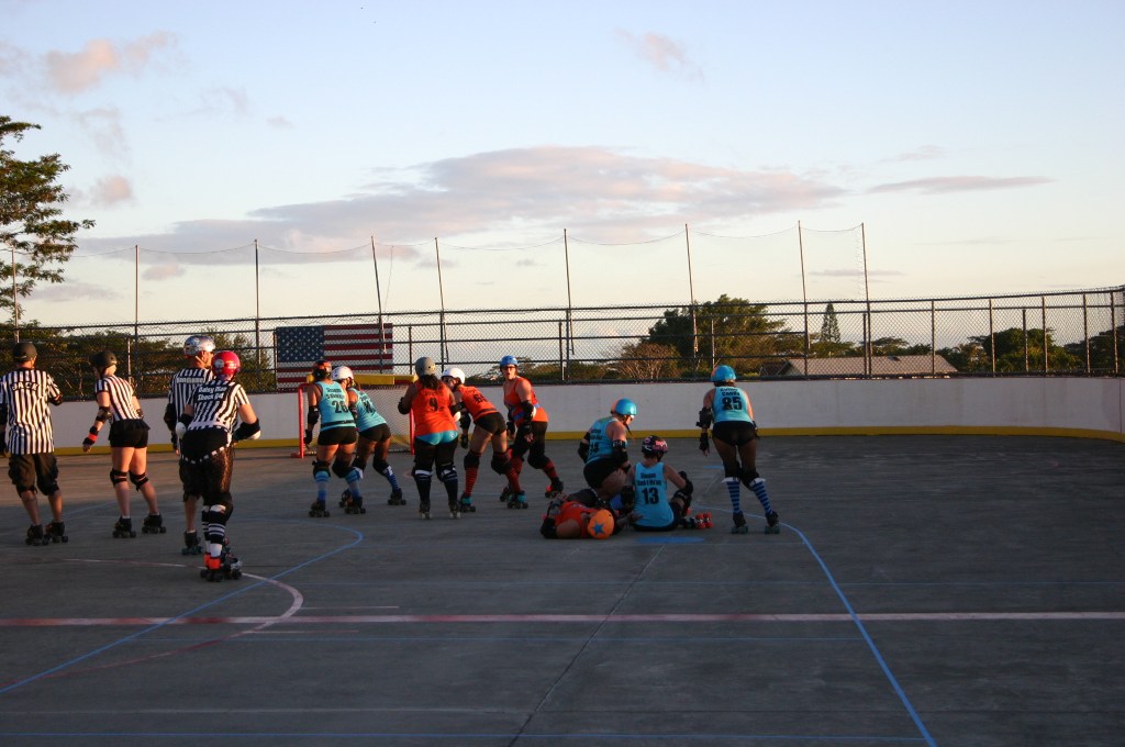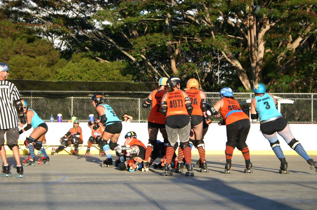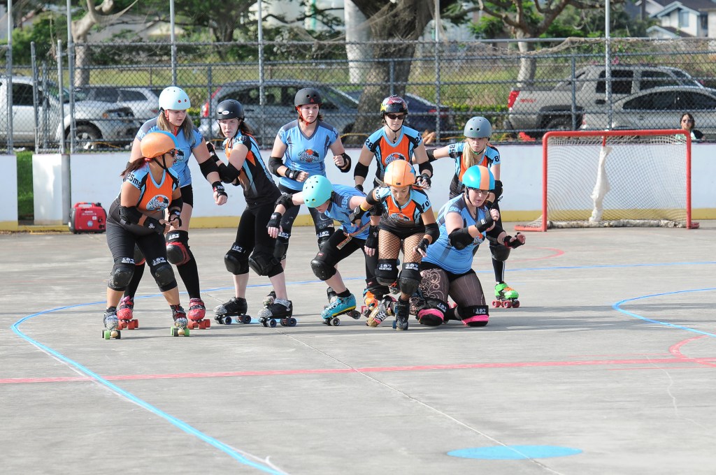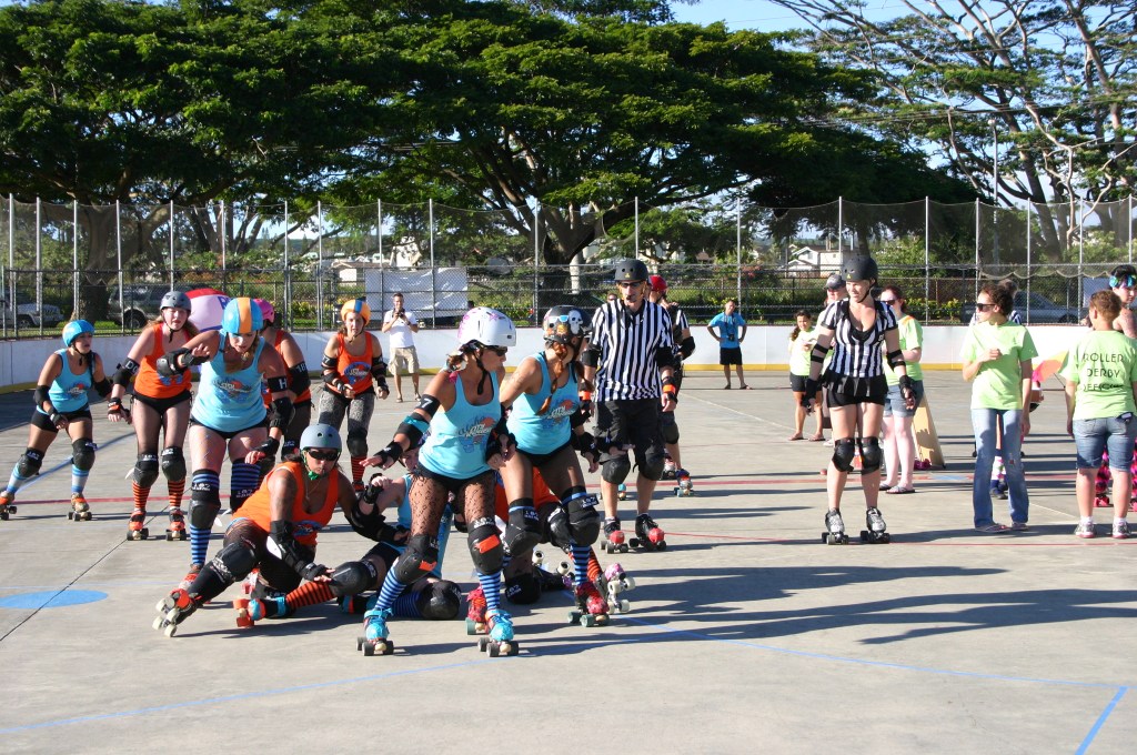 Falling is part of playing roller derby. Players do things on skates that are challenging to do even when wearing sneakers! Players fall by getting knocked down, tripping, and slipping. Players learn and practice many types of falls to be able to safely react to different situations. Players still get injured even though they train and wear safety equipment suffering sprains, strains, scrapes, bruises, cuts, dislocations, broken bones, and concussions. Roller derby players train to fall forward and use the padding and protective gear. Below are is a slideshow of intentional and unintentional fall highlights from Aloha City Rollers games, scrimmages and practices.