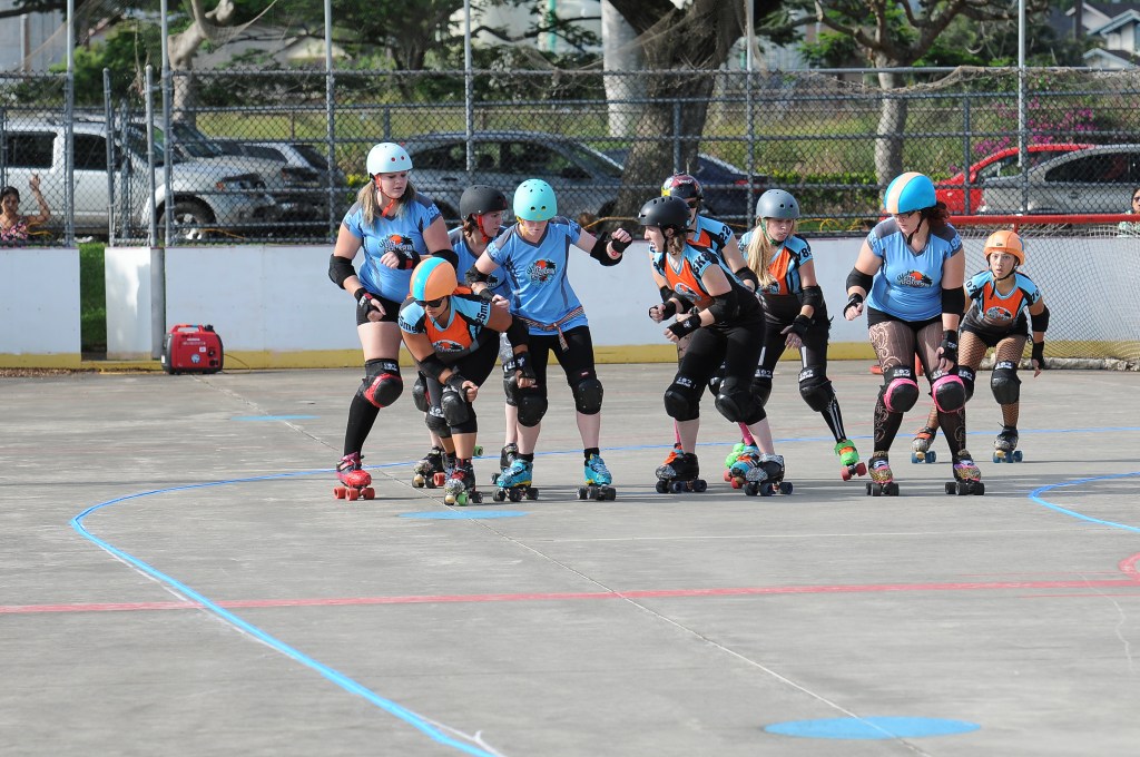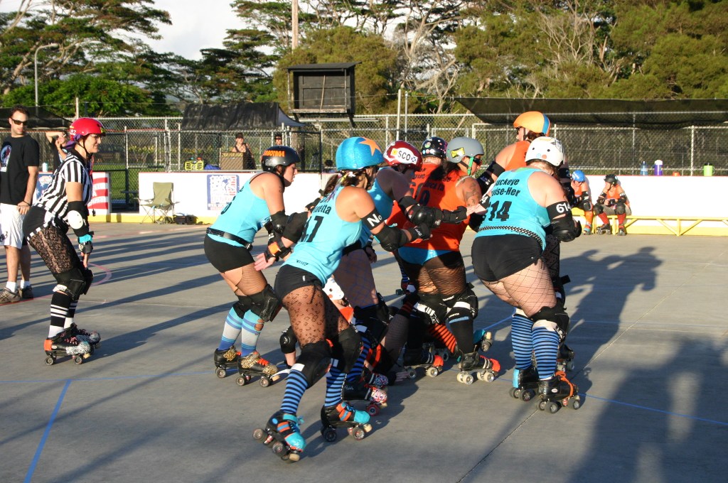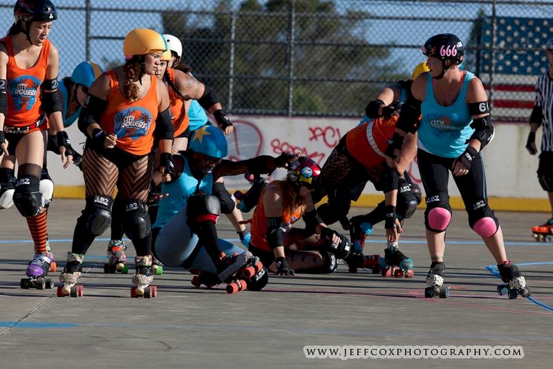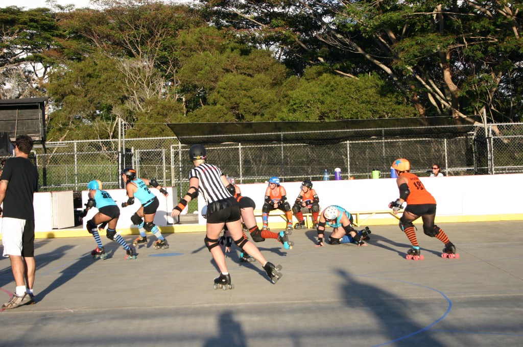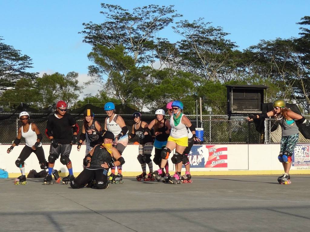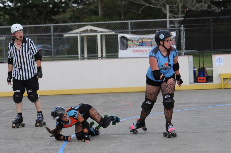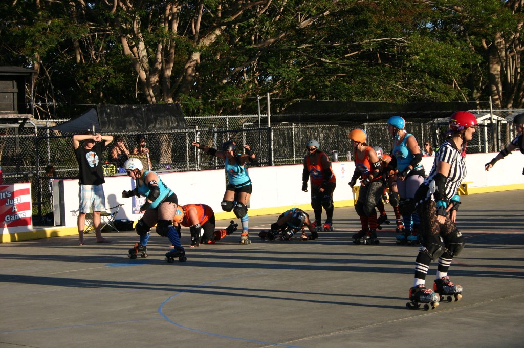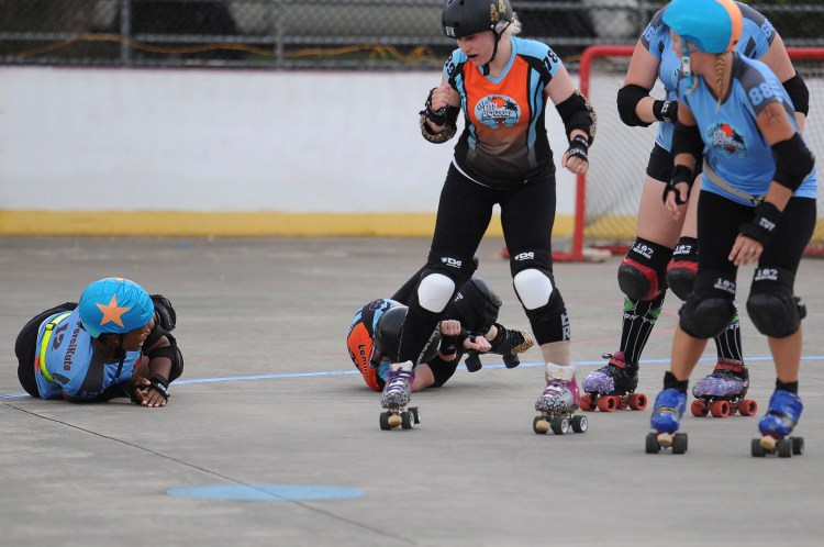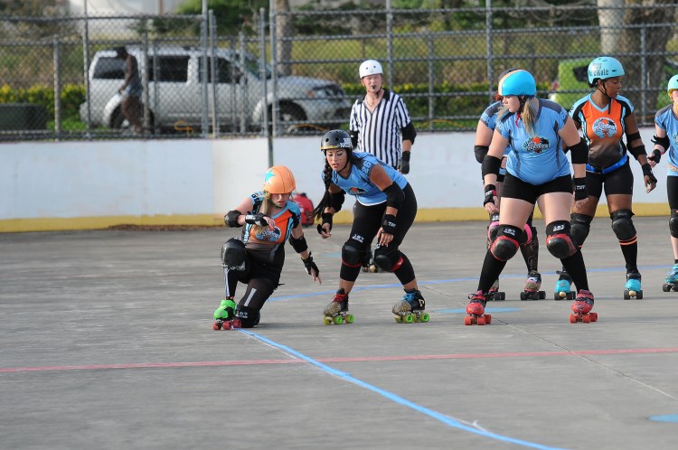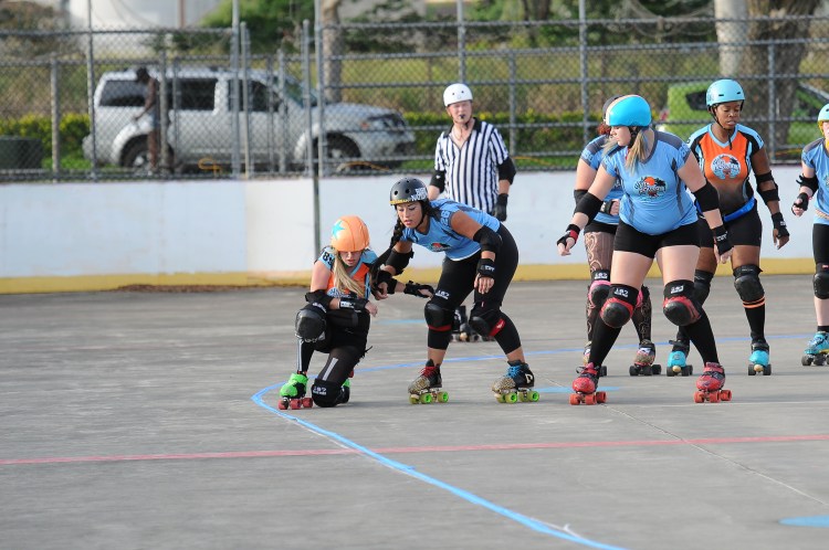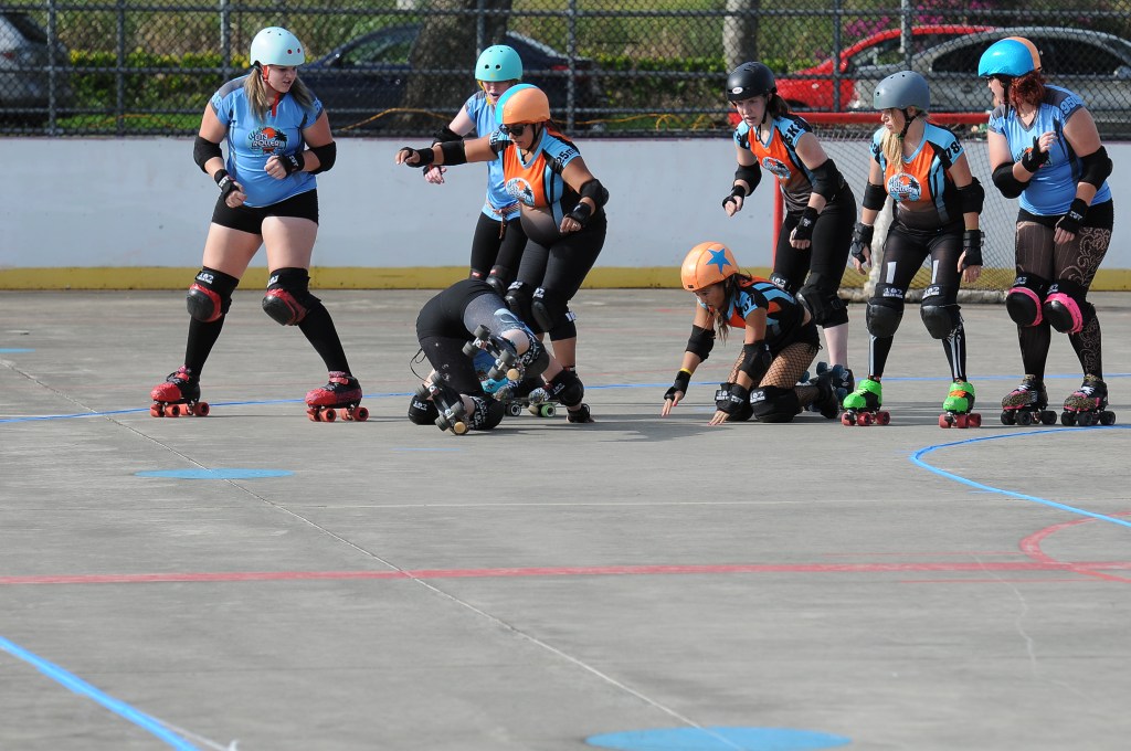 Falling is part of playing roller derby. Players do things on skates that are challenging to do even when wearing sneakers! Players fall by getting knocked down, tripping, and slipping. Players learn and practice many types of falls to be able to safely react to different situations. Players still get injured even though they train and wear safety equipment suffering sprains, strains, scrapes, bruises, cuts, dislocations, broken bones, and concussions. Roller derby players train to fall forward and use the padding and protective gear. Below are is a slideshow of intentional and unintentional fall highlights from Aloha City Rollers games, scrimmages and practices.