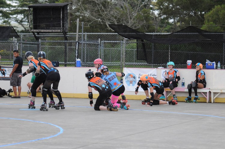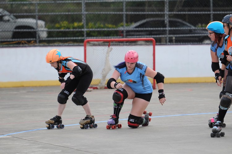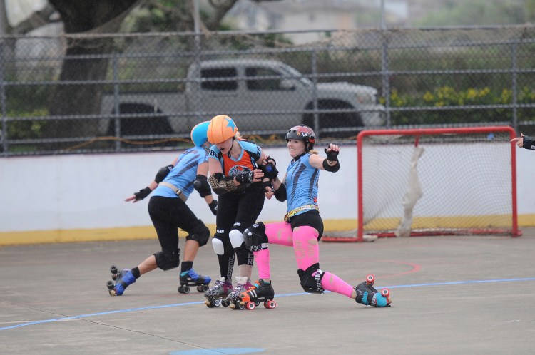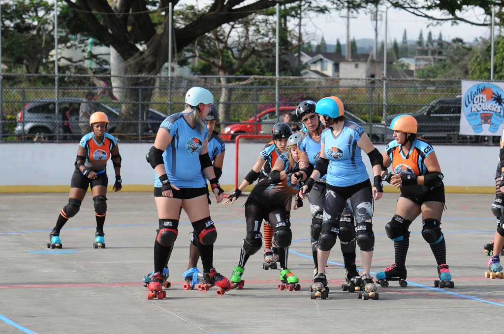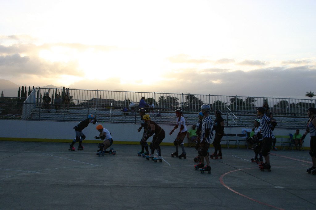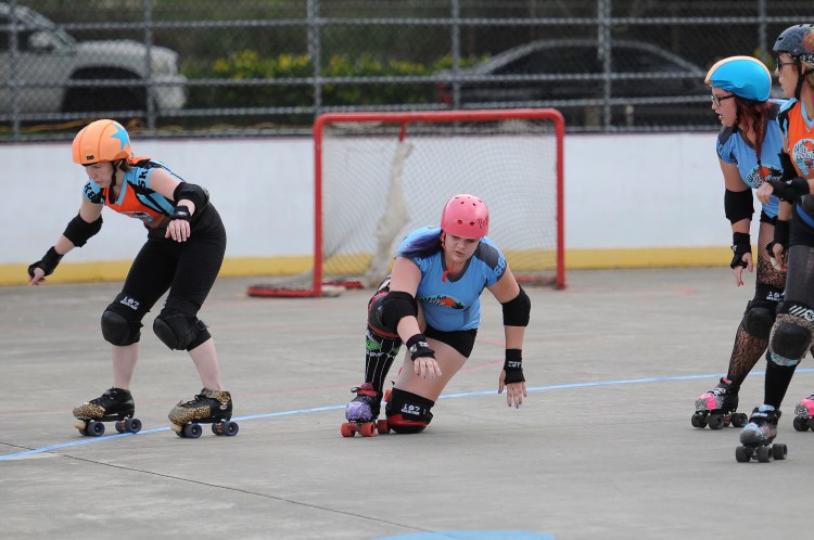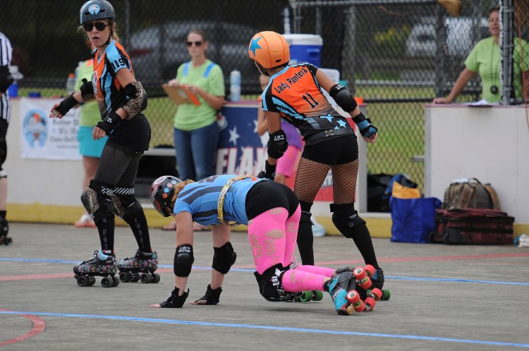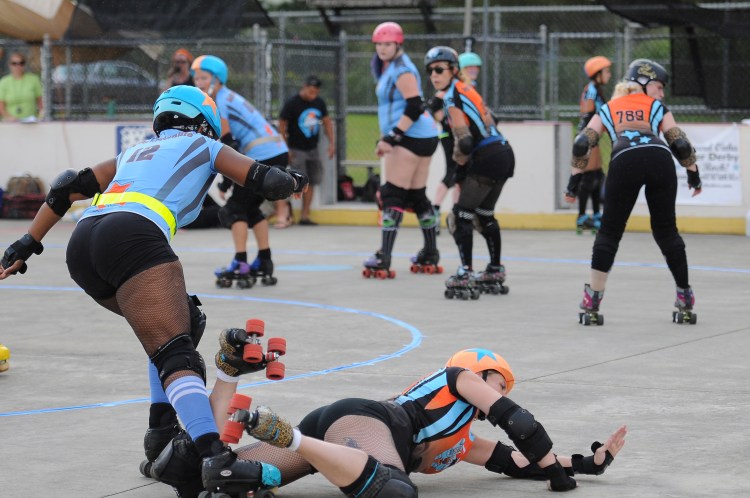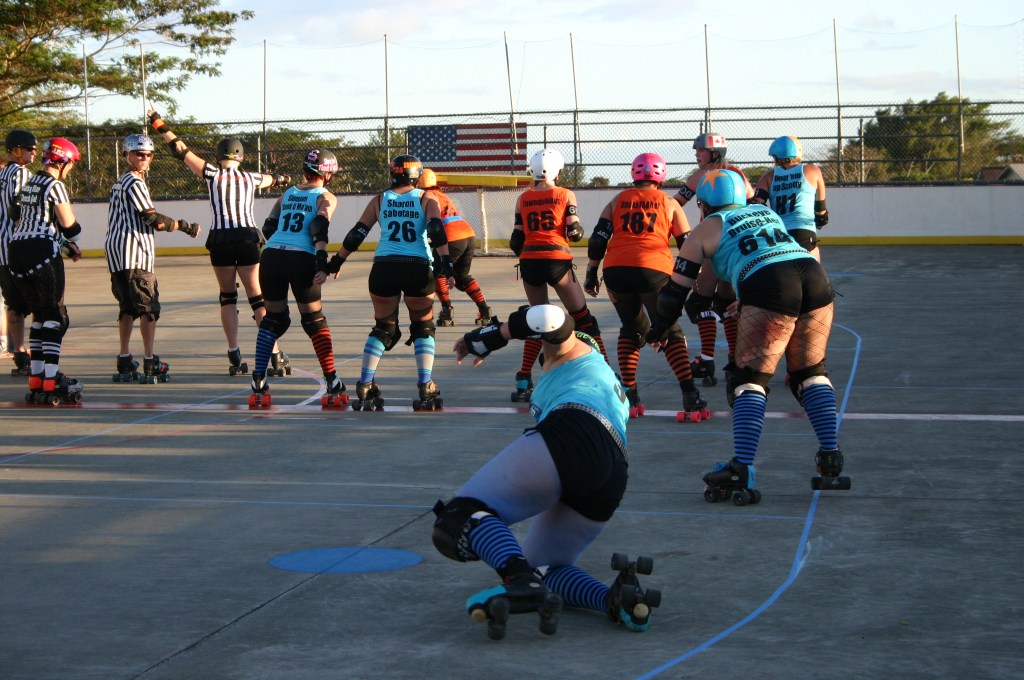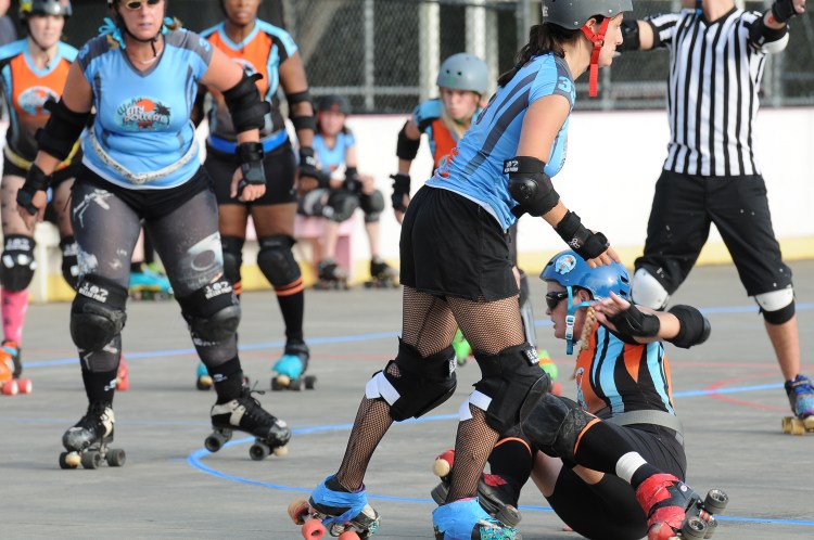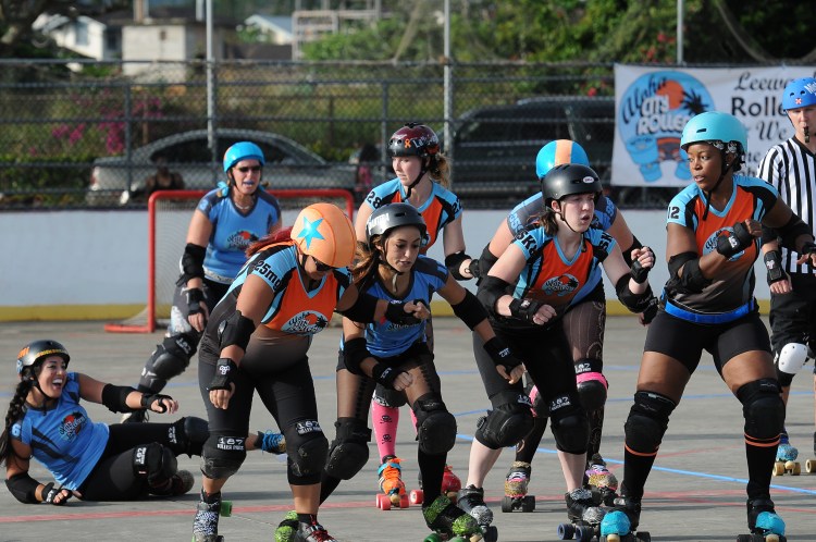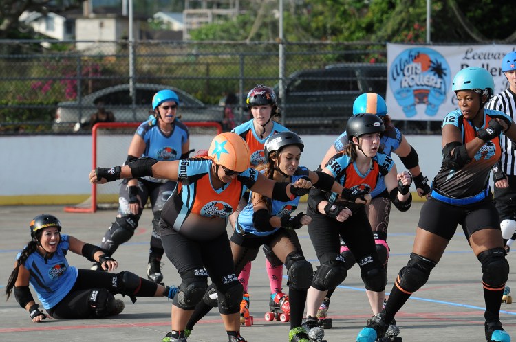 Falling is part of playing roller derby. Players do things on skates that are challenging to do even when wearing sneakers! Players fall by getting knocked down, tripping, and slipping. Players learn and practice many types of falls to be able to safely react to different situations. Players still get injured even though they train and wear safety equipment suffering sprains, strains, scrapes, bruises, cuts, dislocations, broken bones, and concussions. Roller derby players train to fall forward and use the padding and protective gear. Below are is a slideshow of intentional and unintentional fall highlights from Aloha City Rollers games, scrimmages and practices.