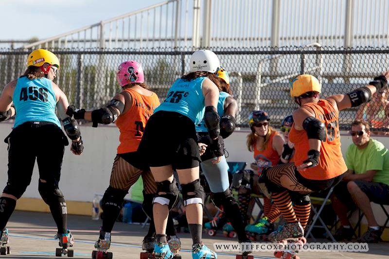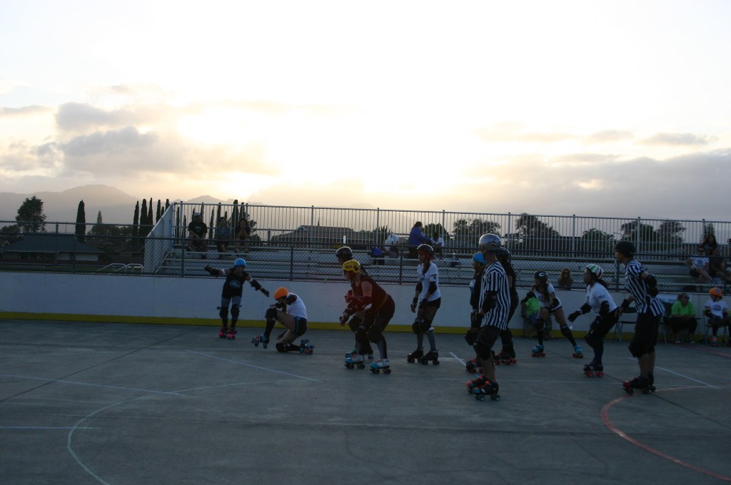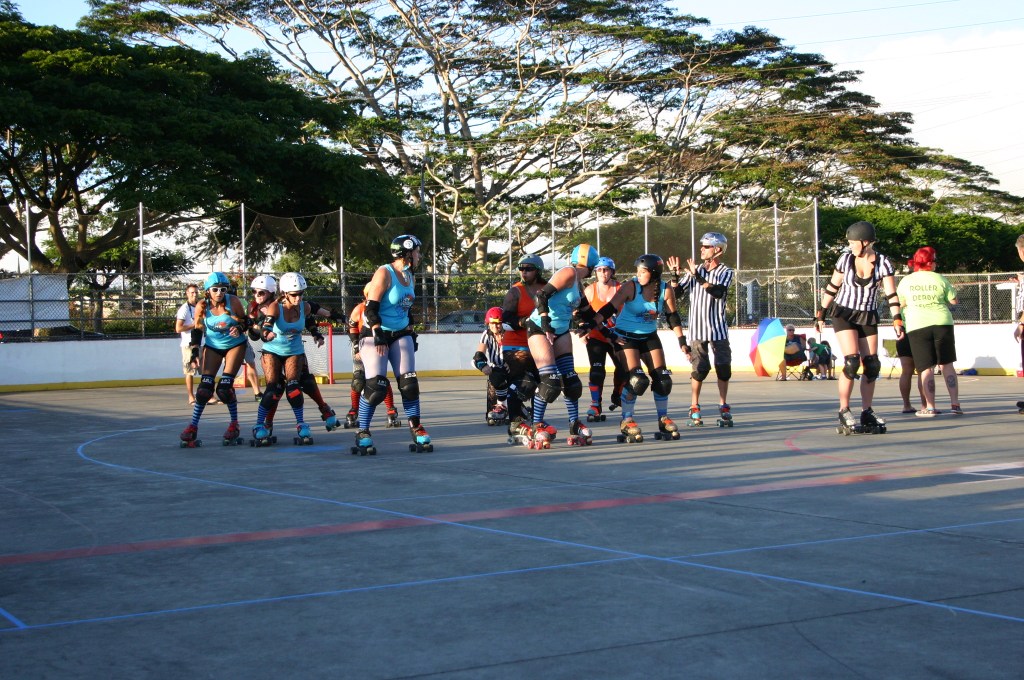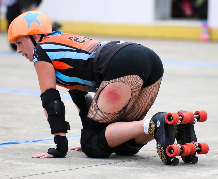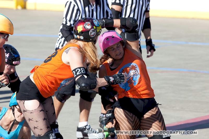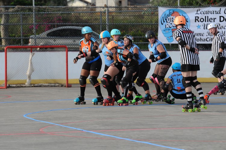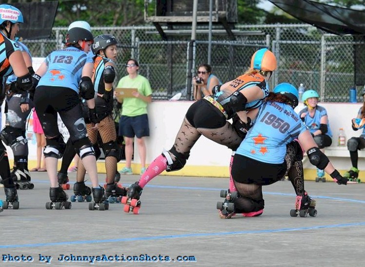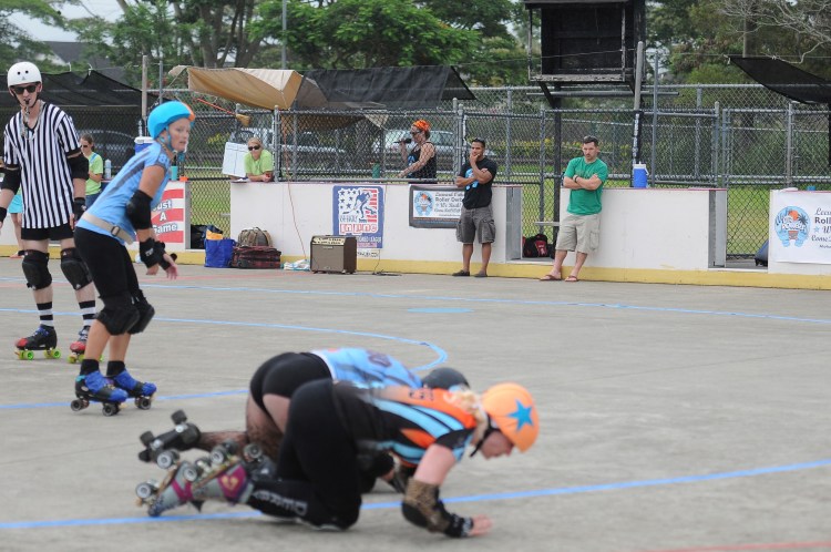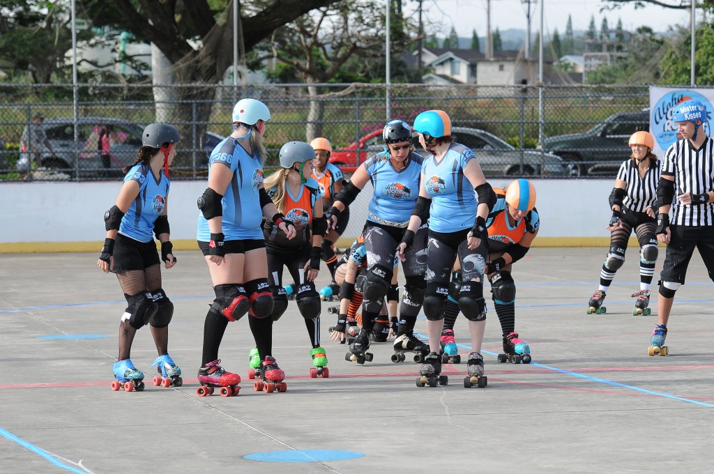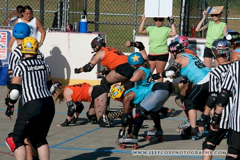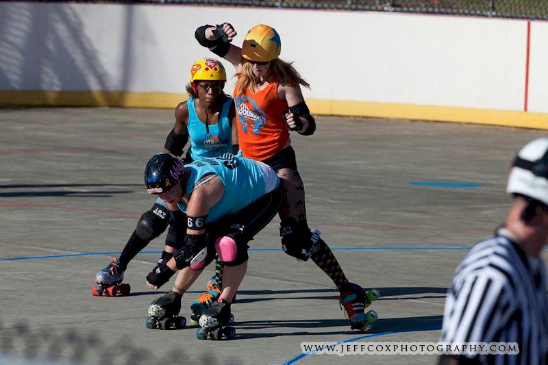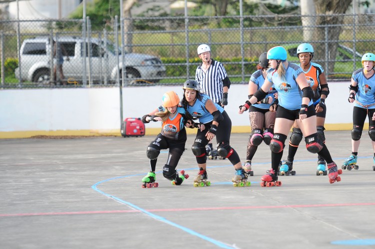 Falling is part of playing roller derby. Players do things on skates that are challenging to do even when wearing sneakers! Players fall by getting knocked down, tripping, and slipping. Players learn and practice many types of falls to be able to safely react to different situations. Players still get injured even though they train and wear safety equipment suffering sprains, strains, scrapes, bruises, cuts, dislocations, broken bones, and concussions. Roller derby players train to fall forward and use the padding and protective gear. Below are is a slideshow of intentional and unintentional fall highlights from Aloha City Rollers games, scrimmages and practices.