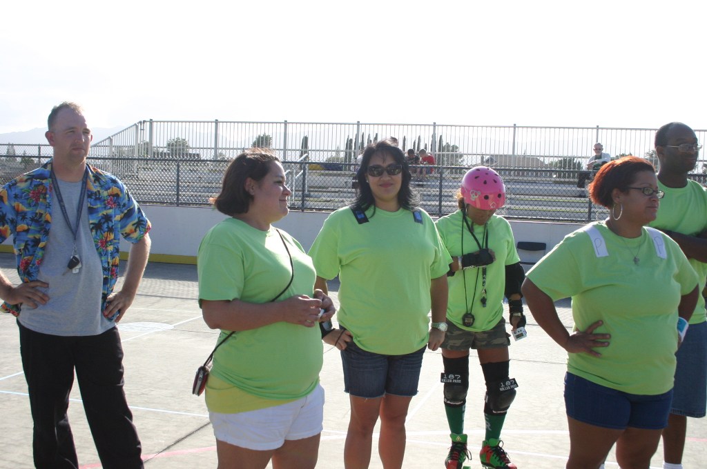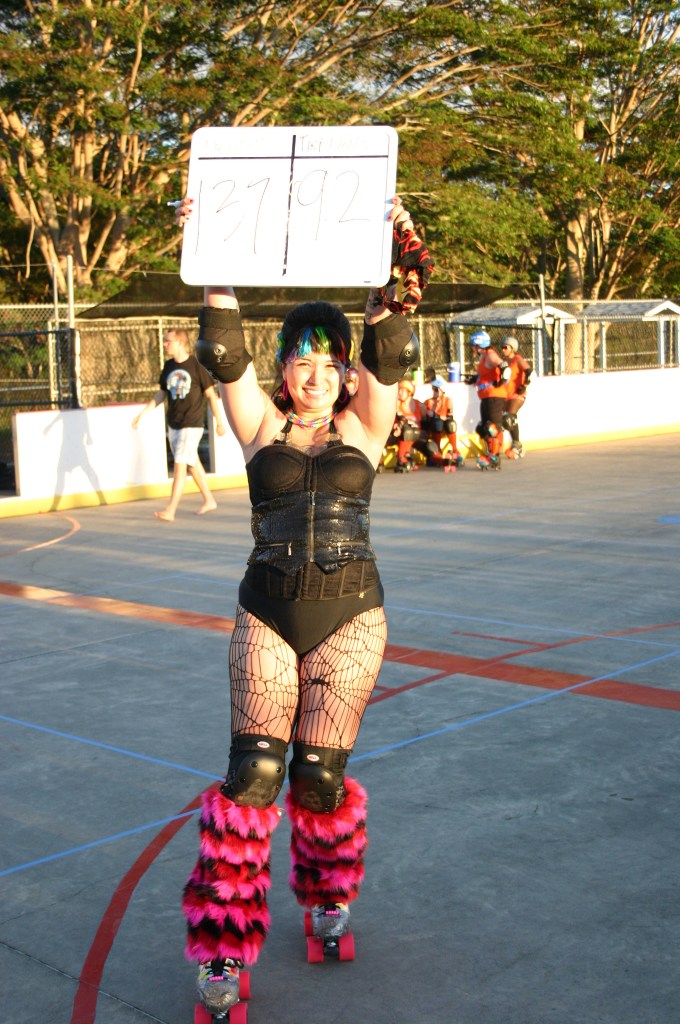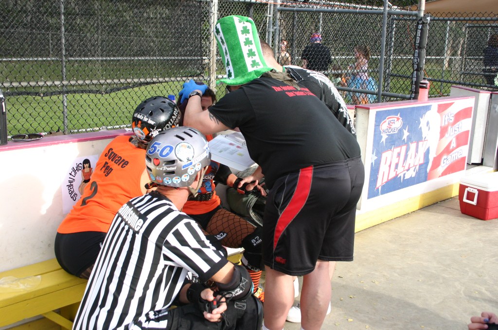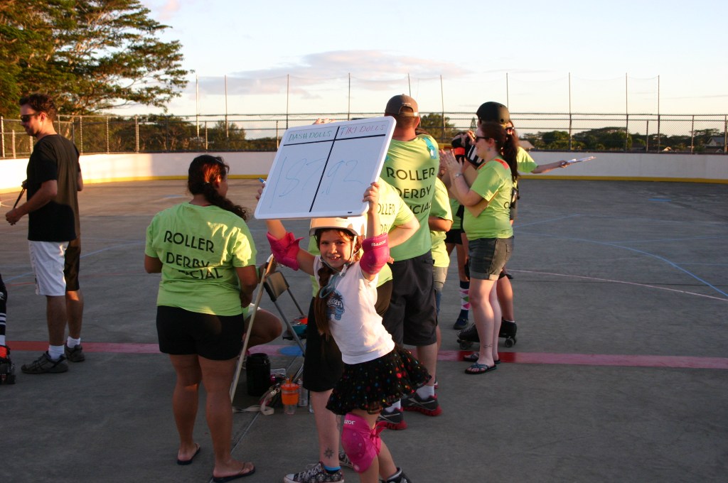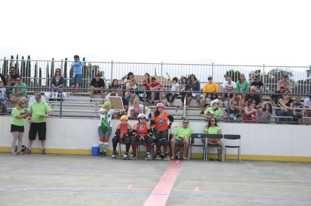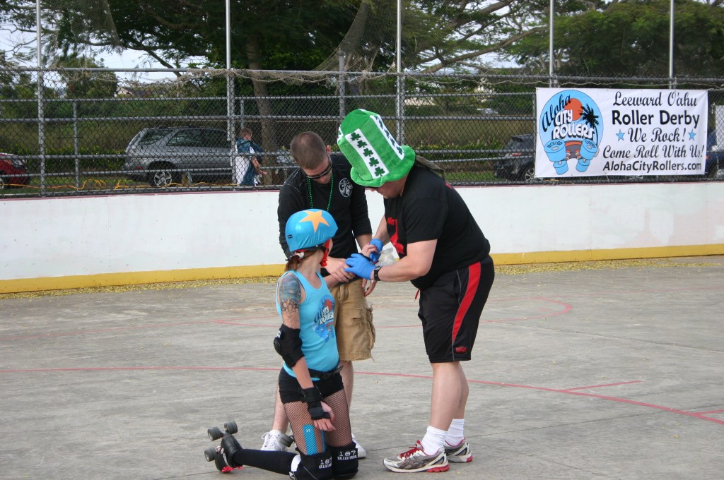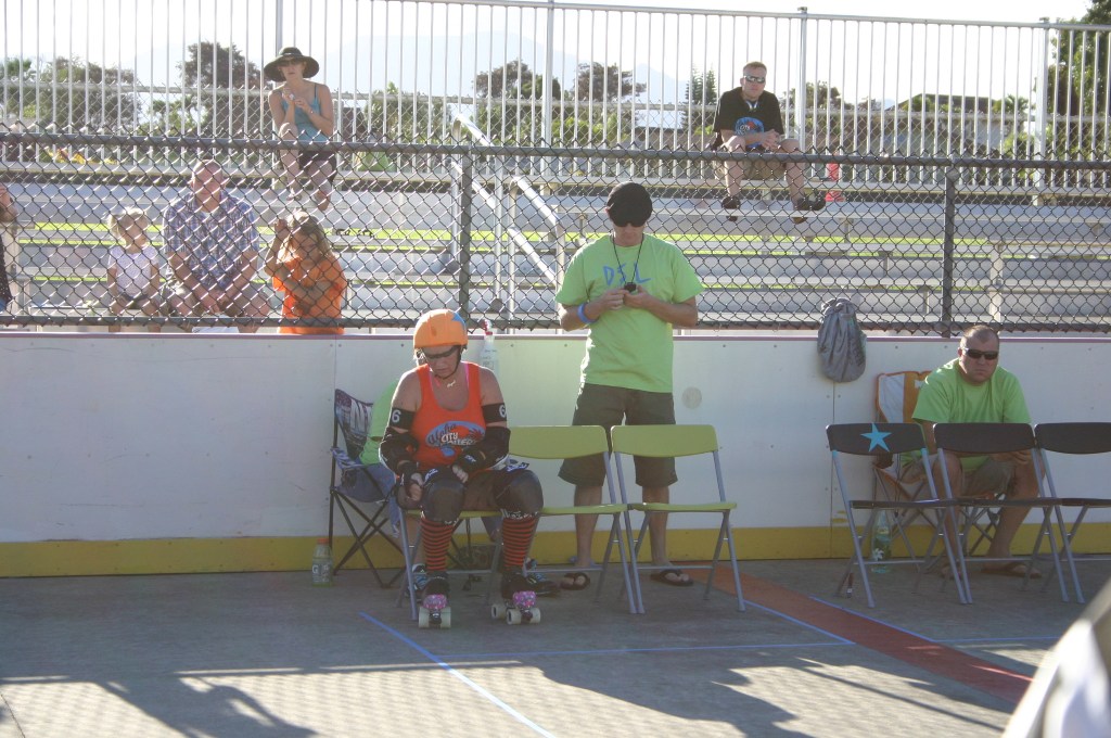 A roller derby scrimmage or bout requires many support members to help keep score, track penalties, run the penalty box, announce and explain what is happening to the crowd, and bandage up scrapes that may happen. NSOs are Non Skating Officials and they assist the referees in keeping the game safe and fair. Many spouses and friends helped out Aloha City Rollers as NSOs. Many prospects who considered playing but couldn’t commit to the practices supported the league as NSOs. All fresh meat should help their leagues as NSOs to better learn the rules and gain a greater understanding of how roller derby is played. Injured players should also support their league as NSOs during their recovery.